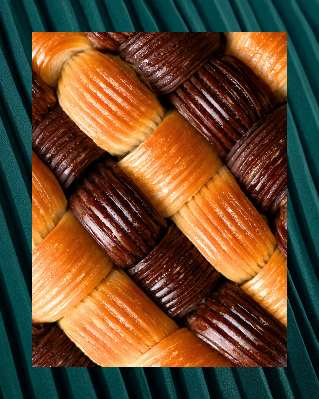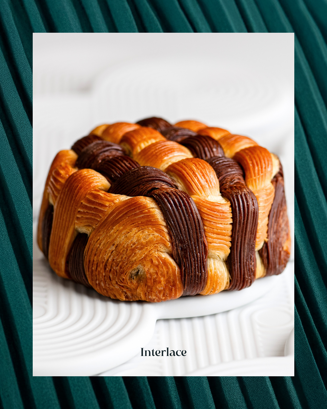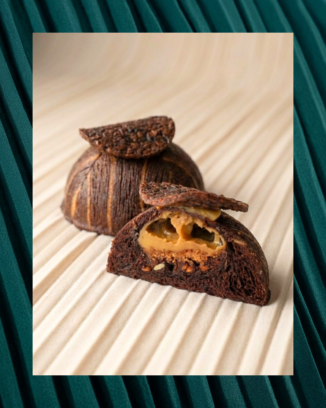 Two croissant doughs — plain and Mayan Red cocoa — woven together and then molded into a structured dome, with a rich, indulgent ganache at the core.”